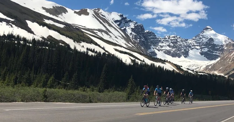 A group riding the Icefield Parkway from Jasper to Banff. The one-way tour is usually completed over three days. The Icefield Parkway is one of the most accessible and beautiful mountain roads in the world.